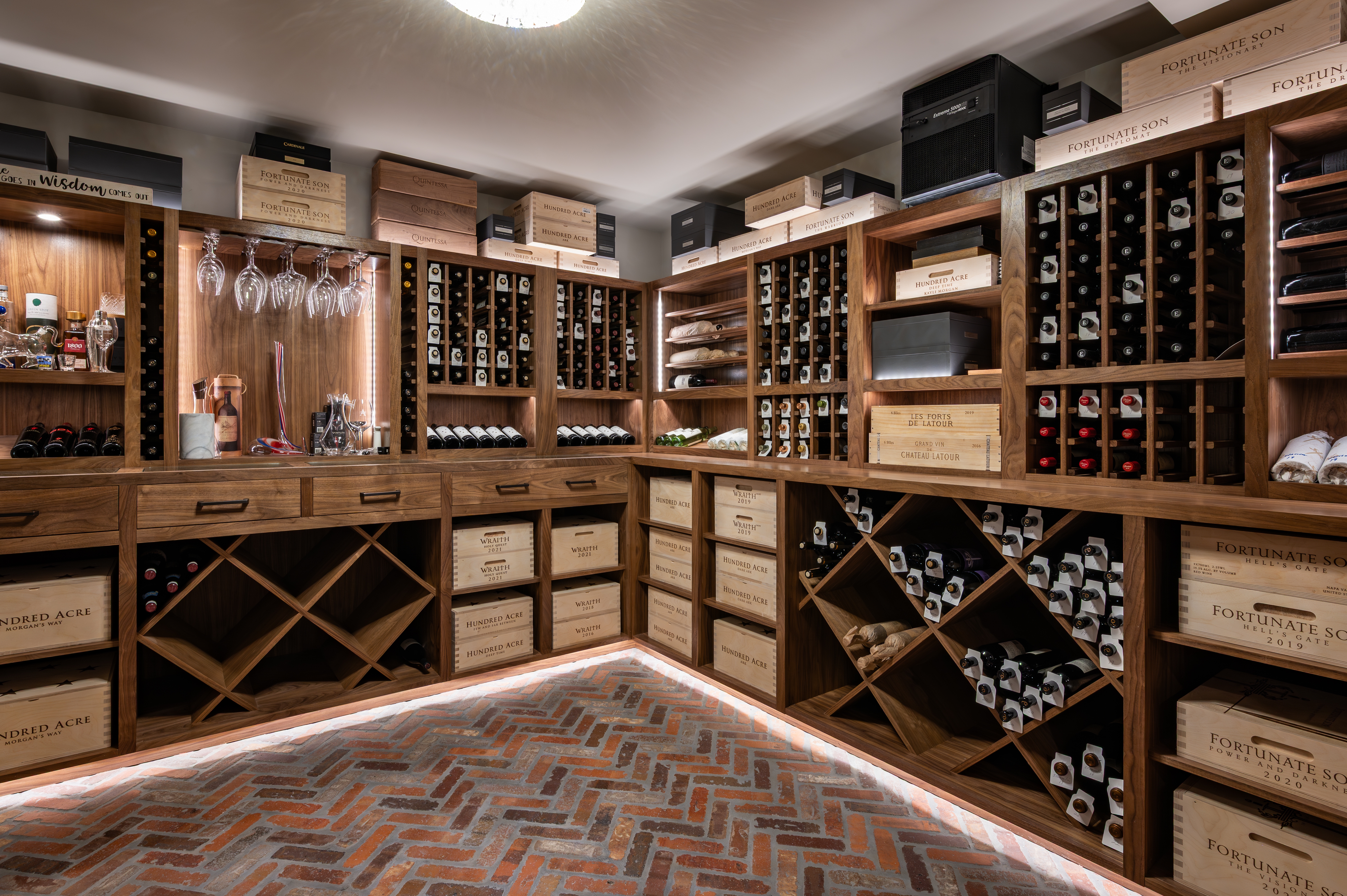 From the initial consultation, the clients leaned toward solid wood wine racking and the more traditional cellar style. Walnut was selected as the feature wood for its depth and timeless appeal. To heighten the cellar’s old-world charm, the Heritage Vine team proposed a chevron brick floor - a detail that cemented the Heritage feel of the cellar space.