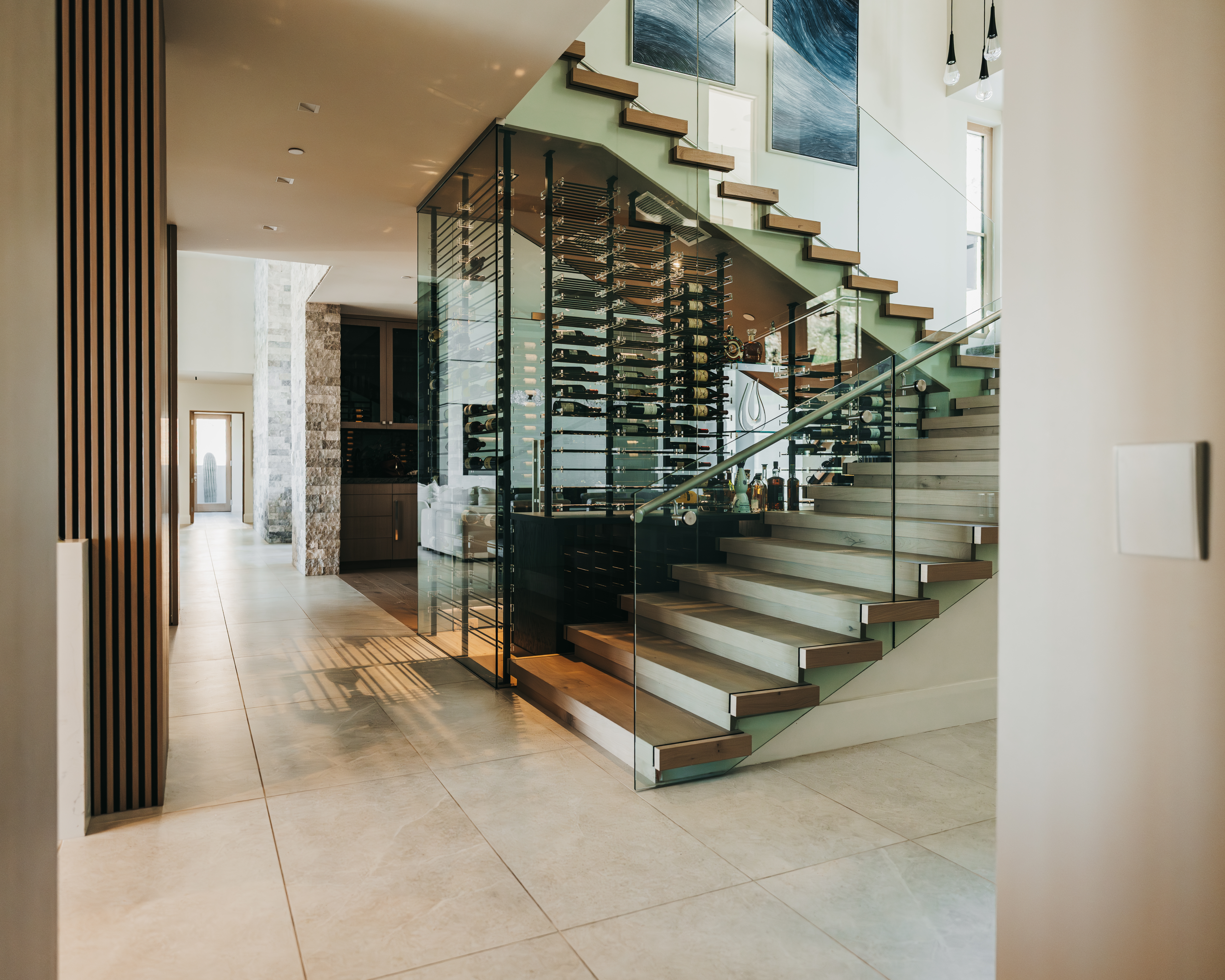 Utilizing the space under the home's magnificent staircase, Heritage Vine had the pleasure of designing this cellar from scratch to match the aesthetic of the luxury living surrounds. To maintain the open plan feel of the walk through space, the cellar is enclosed with clear glass panels, flowing past the base of the staircase through to the steps. With a considerable personal collection, the cellar had to have ample capacity within a confined space. To hold the collection without disrupting the design, the oak wood base section features double stacked racking for added storage. Angled custom holders accommodate and showcase large-format bottles and magnums, whilst a counter runs along the adjacent wall to provide a functional space for pouring. Minimalist black aluminum racking holds the rest of the collection against the glass panels, creating a feature wall of wine on display with a clean, elegant finish. This stunning cellar is then enhanced with considered, delicate LED lighting, subtly illuminating the collection with a moody, atmospheric glow.